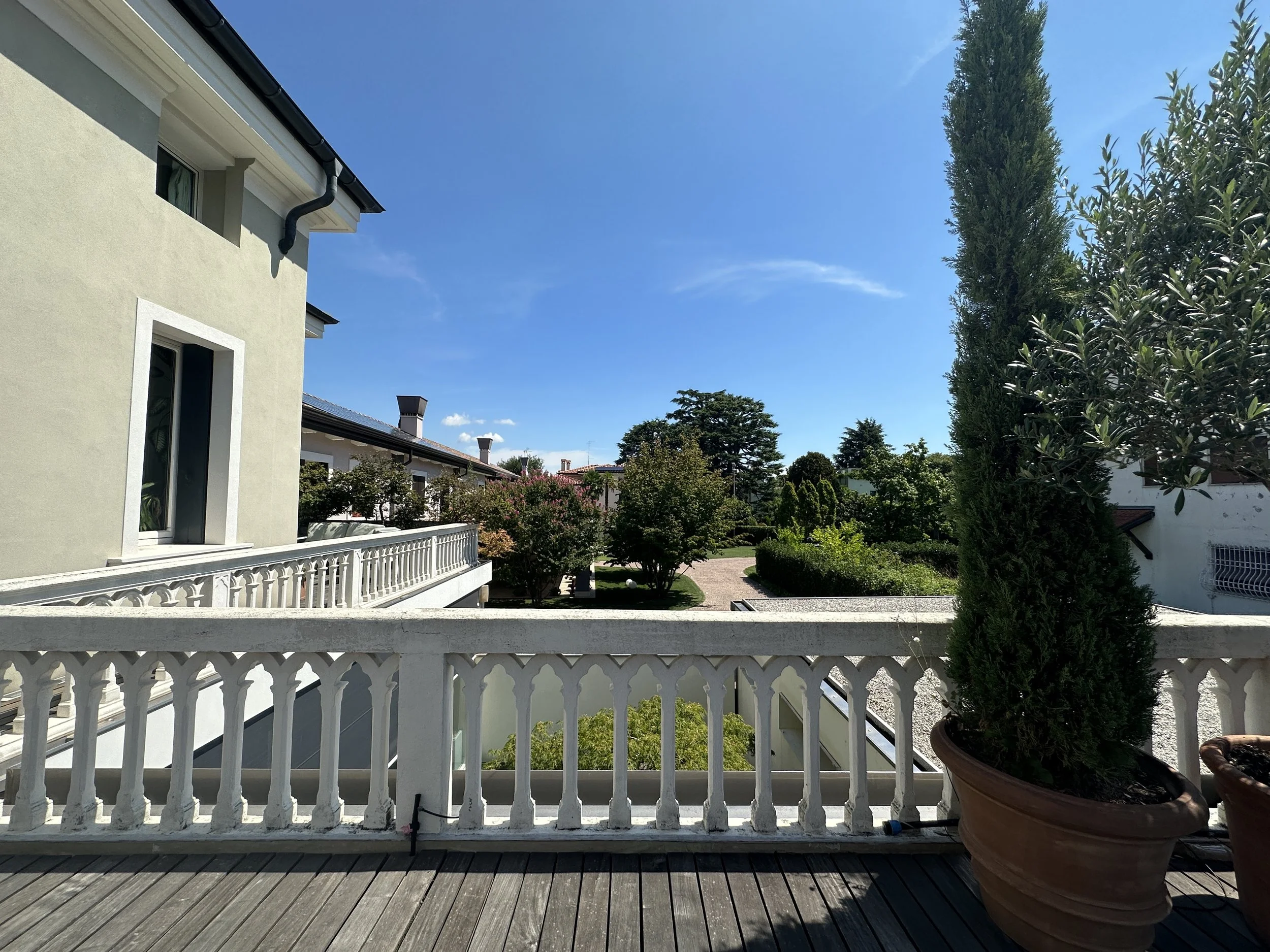 Il primo piano ospita una zona living con camino a gas, cucina separata, bagno di servizio, camera padronale con bagno en suite e cabina armadio. Ampia terrazza abitabile di 100 mq con pompeiana e impianto di irrigazione automatizzato.